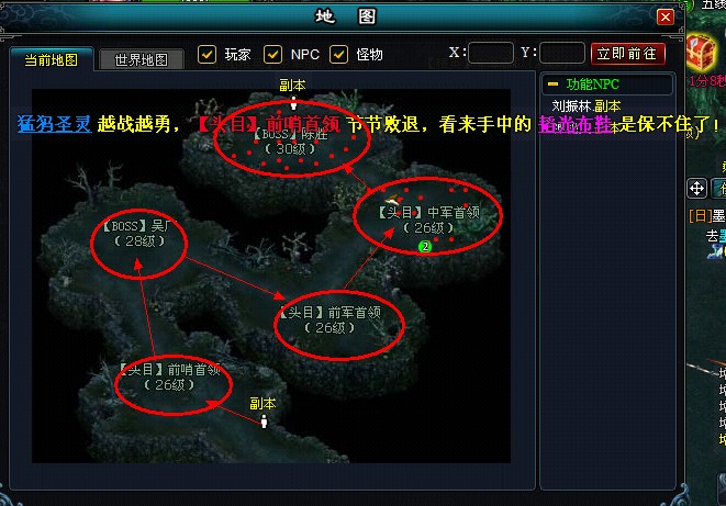 在吴栋副本中,玩家要面对无波怪物和五个BOSS的挑战,副本为区域据点式战场,每一个据点都有一个BOSS在守着,其中最大的BOSS是吴广和陈胜,分别驻扎在第二关和第五关。其余的分别为前哨首领,前军首领和中军首领。等级在32级之前,和这些BOSS战斗需要考虑到差距防御值,因此需要准备好补血用的药水。