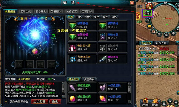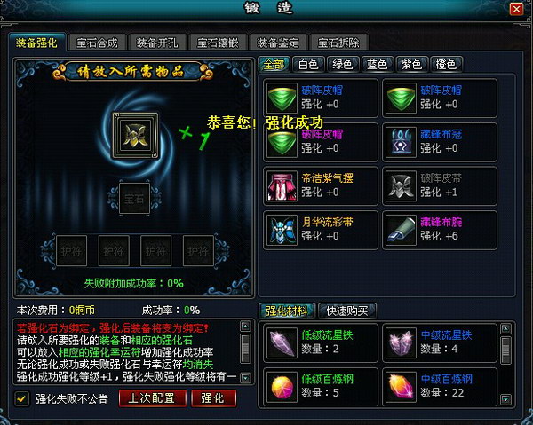 装备强化主要用于提升装备的主属性,例如增加武器的攻击力,防具的防御力等。装备强化除了要放入所要强化的装备外,还需要放入4399的强化石。武器与坐骑的强化需要放入流星铁,防具与饰品的强化需要放入百炼钢。当然,强化等级的不同需要放入的强化石等级也不同,+1至+3需要放入低级石头,+4至+6需要放入中级石头,+7至+10需要放入高级石头。强化的等级越高,成功率越低。当然,你也可以通过放入强化幸运符还提高强化的成功率。