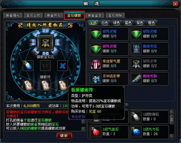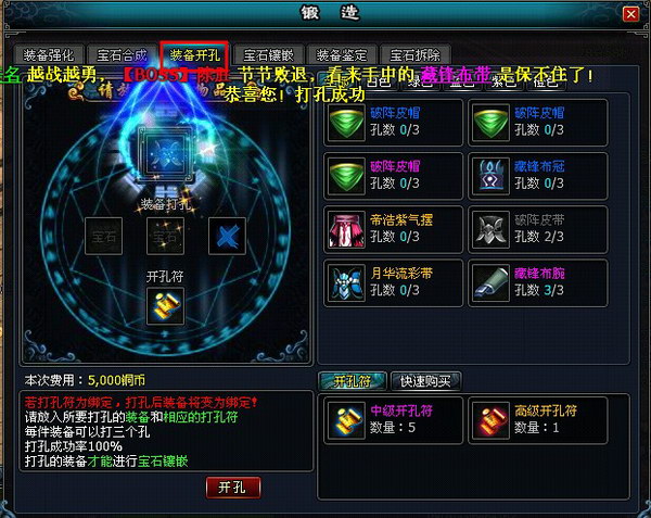 装备开孔主要是通过开孔符在装备上打孔,打过孔的装备才可能镶嵌宝石。不同成色的装备需要的打孔符不一样。蓝色以下装备需要低级开孔符,紫色装备需要中级开孔符,橙色装备需要高级开孔符。宝石镶嵌主要是在装备上打上宝石,打上宝石后可以在装备上增加各种宝石所附加的属性。宝石镶嵌有4399的成功率,一件装备上最多打上三颗宝石,且不能打上同一类宝石。当然,你也可以通过加入镶嵌符提高宝石镶嵌成功率。镶1-3级宝石时放入低级镶嵌符,镶4-6级宝石时放入中级镶嵌符,镶7-9级宝石时放入高级镶嵌符。