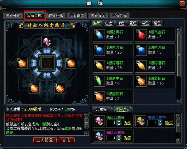 宝石合成主要是通过2个以上的低级宝石合成一个高级宝石。放入的宝石越多,合成的成功率越高,最多可以放入4个宝石,当然你也可以放入一个4399合成符提高宝石合成的成功率。合成2-4级宝石放入低级合成符,合成5-7级宝石放入中级合成符,合成8-9级宝石放入高级合成符。