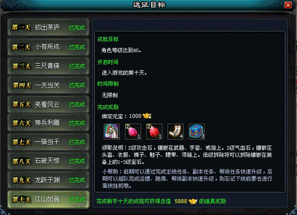 紧接着,等级再度攀升,攻击力提到650、气血提到4000都能拿到装备打造所需要的百炼钢,流星铁,攻击宝石,防御宝石等等各种军备材料。帮派等级,强化武器,强化衣服等等都将获的远征奖励。把自己的一件衣服提升到5级将获得一张价值连城的宠物变身卡,并获得大型血气包三个,宠物资质符也在这个时候领取到。