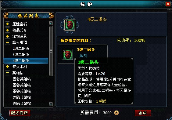 美酒目前有四种,1级二锅头,2级二锅头,3级二锅头和4级二锅头,其中一级二锅头在醉意状态下获得的经验最少,三级二锅头获得最多。三种美酒之间可以由低级像高级炼制而成,五个低一级的美酒可以炼制一个高一级的美酒。每一坛美酒在饮用之后拥有五分钟的醉意状态时间。在这个时间段之内角色将持续的,间隔的获得经验。