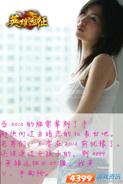 2012的船票拿到手后,赶紧向心爱的女孩子表白吧!如果还没追过女孩,在4399《英雄远征》中来追我,我教你!——S27服 半面妆。