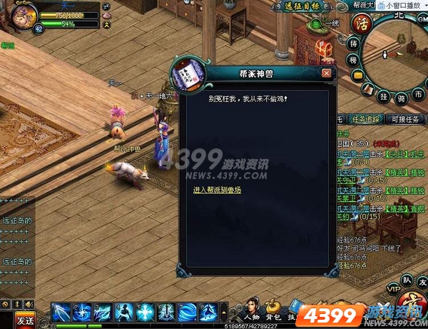 当帮会神兽心情足够高的时候就可以开始喂养了,心情越高,同样的喂养得到的成长值越高,超过1000的时候,帮主和副帮主就可以祭唤神兽出来到帮派驯兽场,合帮帮众击杀之,帮会奖励滚滚来。神兽食物可以通过完成帮派任务获得。