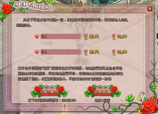 “缘”,多么神奇的字,当它在你的界面下方出现的时候,就代表有玩家已经向武陵城NPC处领取了任务。打开天降奇“缘”的宝盒,就可以选择自己心仪的对象啦。当GG把消耗了1万铜钱的宝贵香薰、10元宝的同心玉佩赠与MM的时候,两人即共享点燃一朵心形红烛围绕的世界~可真够浪漫哦。