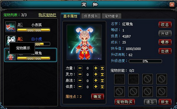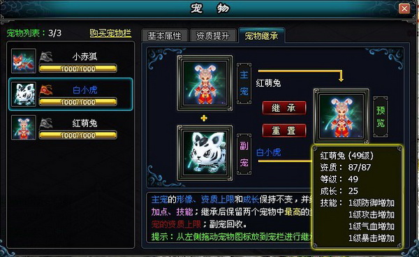 好宠牛掰,但是想要直接抓到一个极品宠还是有挑战的,所以通常的方式还是边养边继续抓。毕竟烽火乱世,到处刀光剑影的,作为实力重要组成要素的宠物可是一时都缺不得。再说了,随着全民抓的的开放,全新宠物驯养中还开启了继承的功能。也就是说,不用担心各种看似不好不坏的单方面优秀宠物无用武之地,丢了又可惜。宠物继承,可以在保留主宠的形像、资质上限和成长的前提下,继承副宠的等级、属性加点和技能,并且保留两只宠物中最高的当前资质。所以嘛,不管怎样,养宠的付出总不会浪费的。
