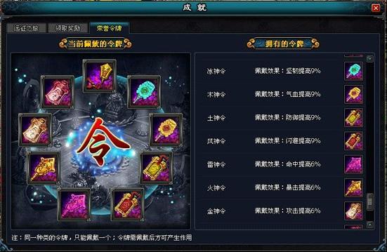 英雄远征的成就系统中有着一项为奇珍异宝,记录着英雄儿女的一些特定的成就,主要达成满足条件后,可获奖丰富的珍稀物品或者相应的成就令牌。目前为止,在英雄远征中总共有九种荣誉令牌,分别为金木水火土+风雷金毒。而作为荣誉转化为实力的承载物,其对应关系为:水神令加内力,冰神令加坚韧,木神令加血气,土神令加防御,风神令加闪避,雷神令加命中,火神令加暴击,金神令加攻击,毒神令加抗性。