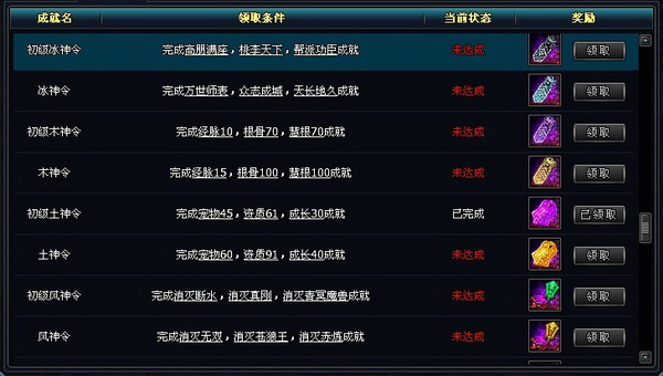 水神令获得主要是对应着相应的奇珍异宝中的任务成就,而冰则是对应相应的交互成就。任务成就则不用多说,作为一个最基本的成就,也是我们成长点滴的记录者,一般都是在不知然间即以完成!而交换成就作为兵戈乱世中的社会支撑,师徒好友,帮派情人,众记载着我们的情义,也见证着我们的成长。想要在这片自由战域中崛起 ,这两个是最为基本的成就考核,当然令牌属性也就一般。