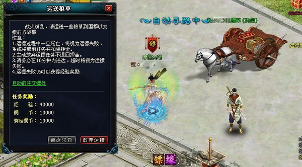而在全新运镖中,有一个重要的更新和保护就是,高等级玩家无法截低等级玩家的镖。也就是说现在遇到劫镖不用再像以前毫无反抗能力,那时多半是遇到的都是比自己高个十多级,活生生被秒,或者有时候实在不舍的在中途直接放弃运镖,这样谁也得不到。而现在可不同的,谁敢劫镖,至少哥跟你死过。反正能劫镖的大家等级都差不多,谁怕谁。而且现在运镖途中还有直接的快捷申请帮派求助。