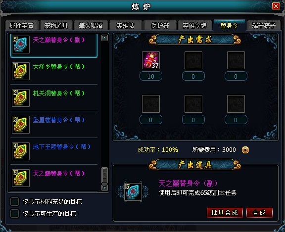 虽然说有点不合英雄之气,但是替身娃娃的出现的确让我们更加轻松自在,也乐得逍遥。在游戏中,收集到一定的替身娃娃,即可以在炼炉中合成相应的替身令,只要使用相应的替身令,即可立即完成相应的副本任务。轻松快速,让那些没有太多时间做任务或者自身实力难以完成副本的玩家找到了全新的发展方式。