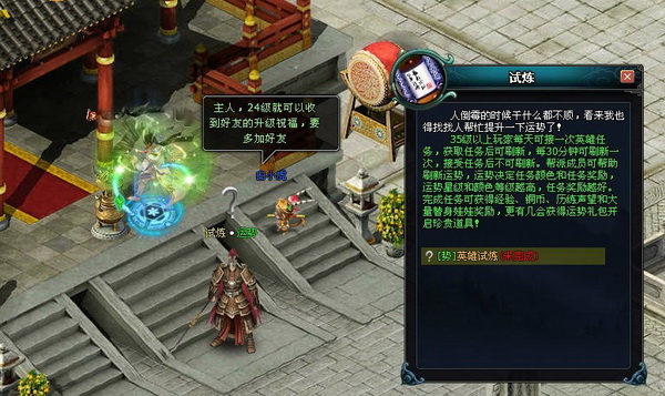 各路英雄儿女,每天都可在武陵城接受一次英雄试炼。英雄试炼可以让帮派成员可帮忙刷新运势,而运势的星级越高,颜色等级则越高,任务奖励会越丰厚,在完成英雄试炼之后可获得经验、铜币、历练声望以及大量替身娃娃奖励。另外还有机会获得珍贵的运势礼包!