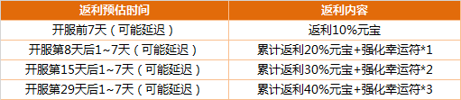 活动内容:充值可获得额外100%充值元宝返利!其中即时返利10%,其余90%将于开服7天后间隔时间分批返还(实际发放时间视实际情况可能延迟数日),一共返利100%!不与其他全服返利活动叠加。